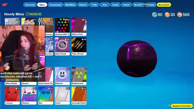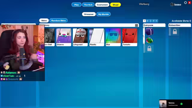 03:13:18Die Streamerin ist überwältigt von den vielen Skins und Anpassungsmöglichkeiten im Murmelspiel, die sie bisher noch nie beachtet hat. Sie entdeckt Chest Gamba und fragt sich, wann Murmeln Pay to Win geworden ist. Sie öffnet eine Chest mit Tournament Coins und erhält ein Triangle, mit dem sie aber nichts anfangen kann. Sie versucht, ihren Tomaten-Skin auszuwählen und die Katze hinzuzufügen. Sie stellt fest, dass die Standard-Murmel nicht mehr weiß ist und dass sie ein Murmel-Noob ist. Sie entdeckt, dass man Skin-Slots kaufen kann und überlegt, Sugar Mama zu sein und für ihre Zuschauer Skins zu kaufen. Sie fragt, wie man Community-Murmeln einreichen kann und stellt sich vor, für alle den Tomaten-Skin einzustellen. Sie entdeckt Drag & Drop und kauft einen Clown-Skin und ein Regenbogen-Ding für die Community-Murmeln.