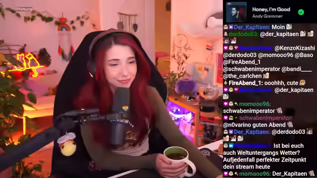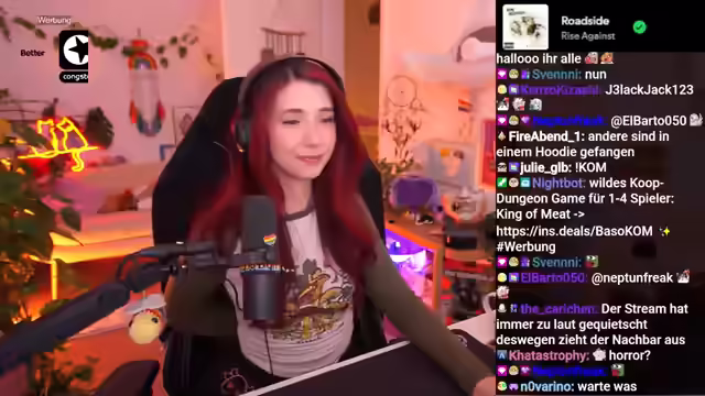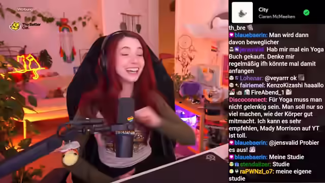 00:10:10Der Stream beginnt mit technischen Schwierigkeiten, da die Streamerin kurzzeitig vergisst, ihr Mikrofon zu aktivieren. Nach der Behebung des Problems begrüßt sie die Zuschauer und kommentiert das verregnete Wetter in Berlin. Sie zeigt sich beeindruckt von der Haltbarkeit ihrer Locken, die noch von einem Event vor drei Tagen stammen. Die Streamerin erwähnt, dass sie ihre rote Haarfarbe aufgefrischt hat, aber bedauert, dass sich die Farbe schnell auswäscht. Sie scherzt darüber, ihre Haare erst wieder vor einem realen Treffen waschen zu wollen, um die Farbe länger zu erhalten. Es wird die rote Tönung von Maria Nila (Nummer 0.66) empfohlen, die zwar teuer, aber farbintensiv sei. Die Streamerin spricht über kalte Füße und das Auslassen der typischen Herbstphase mit milderen Temperaturen. Sie beantwortet Fragen zur Haarfarbe und teilt mit, dass sie die Haare damit etwa zwei- bis dreimal färben kann, abhängig von der Haardicke.