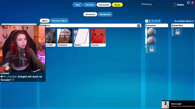 03:09:44Lesky führt einen Raid durch und die Streamerin bedankt sich dafür. Sie fragt die Zuschauer, die bereits bei Chris' Stream waren, wie es dort war. Die Streamerin verspricht ihrem Chat, dass sie als Belohnung für das Zusehen beim Placement ein paar Runden Murmeln spielen werden. Sie entdeckt, dass es im Murmelspiel Skins gibt und beschließt, sich einen Tomaten-Skin zu kaufen. Sie ist begeistert von der Idee und kauft ihn sofort. Sie fragt sich, ob sie den Skin direkt ausgerüstet hat oder ob sie noch etwas klicken muss. Sie entdeckt auch Community-Skins und wünscht sich einen mit Luna und Ferox drauf. Sie fragt, wie man Community-Skins einreichen kann.