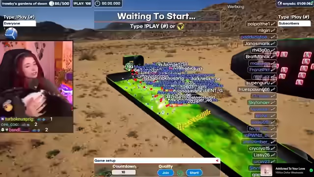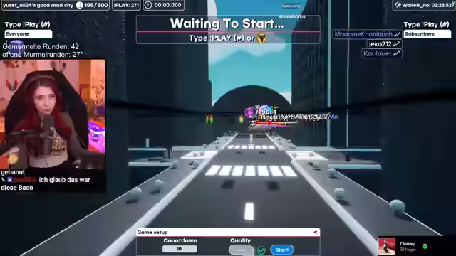 03:37:46Es werden Murmelrennen mit einer Community-Map gespielt, die in zwei Wege unterteilt ist: einen Clown-Weg und einen Regenbogen-Weg. Die Community wird spielerisch in zwei Fraktionen gespalten, Clowns und Regenbogen. Es gibt humorvolle Kommentare zu den Murmeln, die herunterfallen und zum generellen Chaos des Spiels. Eine Murmelrunde wird gespielt, bei der die erste Mummel im Ziel ein Sub oder VIP-Geschenk erhält, während die letzte Mummel möglicherweise gebannt wird. Es wird vergessen, nachzusehen, wer gebannt werden muss, was zu humorvollen Kommentaren über Glück im Leben führt. Es folgt eine weitere Runde auf einer Map im Straßenverkehr-Stil, bei der die Teilnehmenden aufgefordert werden, Play zu schreiben, wenn sie einen Führerschein haben. Es gibt Anspielungen auf Geschwindigkeitsbegrenzungen und die Polizei Hannover auf Twitch.