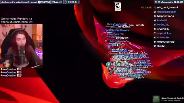 04:21:17Annuin wird VIP, nachdem ein Platz freigeräumt wurde, und Thies führt einen Raid durch, woraufhin entschieden wird, noch eine Runde zu murmeln. Leni wird möglicherweise für immer gebannt, weil sie im letzten Moment ins Ziel gekommen ist. Es wird eine 12-Sekunden-Map gespielt, bei der Baylector in einer Ecke hängen bleibt und länger als die vorgegebene Zeit braucht. Crunchy führt einen Raid durch, und es wird beschlossen, noch eine Runde zu spielen, diesmal mit 30% Dropout-Rate. WayleeSmiley gewinnt mit der Regenbogenmummel, und Sabi erhält ein Sub-Gift. Marcin Ware wird möglicherweise für immer gebannt, weil er als letzte Murmel das Ziel erreicht hat. Es wird festgestellt, dass viele Murmeln rausgeflogen sind. Es wird betont, dass dies die letzte Runde Murmeln für heute ist. Der Chat wird als murmelsüchtig bezeichnet, und es wird angekündigt, dass es nächste Woche mehr Murmeli geben wird. Es wird sich von den Zuschauern verabschiedet und sich für die Unterstützung bedankt.