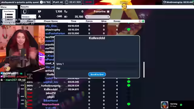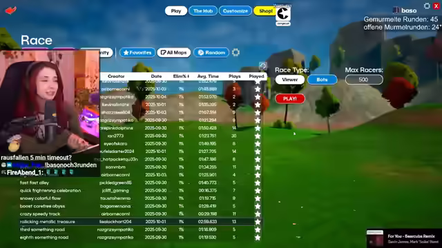 03:27:35Ein Murmelrennen beginnt mit Community Skins. Die Streamerin kommentiert das Spielgeschehen und die verschiedenen Murmeln. Einige Murmeln fallen herunter und scheiden aus. Sie stellt fest, dass es eine Community-Map ist und alles passieren kann. Sie lobt Xerox für den Gewinn mit seiner dreieckigen, coolen Regenbogenmummel. Sie fragt Pherox, wie sein Tag war. Lümmelmax wird als letzte Murmel im Ziel identifiziert und möglicherweise für immer gebannt. Die Streamerin betont das Risiko, das man eingeht, wenn man mit mummelt. Sie kündigt eine neue Runde an und erklärt die Murmelregeln erneut. Sie freut sich über die neuen Community-Skins und die Lagerbildung zwischen Clowns und Regenburgen.