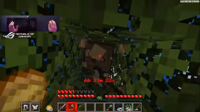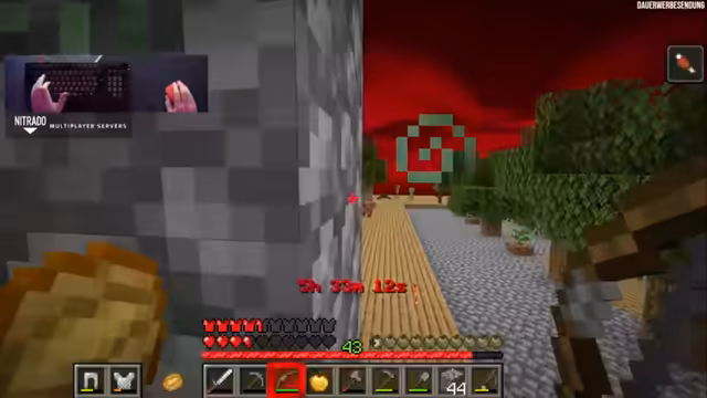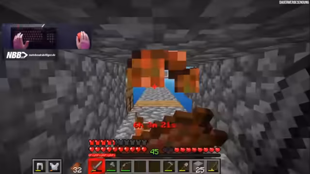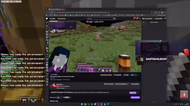 01:56:12Der Stream dreht sich um das Farmen von Ressourcen und das Nutzen von Villager-Handeln. Ein besonders seltener und unglücklicher Vorfall ereignet sich, als der Streamer im Nether-Portal steckenbleibt und durch eine unglücklich abgeworfene Feuerwiderstandstrank-Flasche in Lava stirbt. Neben den Rückschlägen gibt es auch Erfolge, wie den Erhalt von Eisenschuhen durch Handel und die Fortschritte bei der Zombie-Villager-Jagd, die für spätere Projekte entscheidend sind.