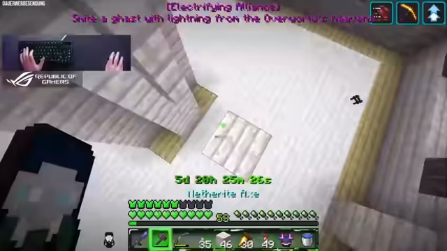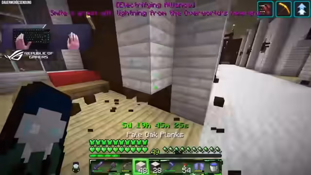 00:27:03Die Hauptaktivität besteht darin, ein Gewitter abzuwarten, um mit einem Channeling-Schwert einen Blitz für ein Achievement abzufangen. Wartend darauf, wird weiter an der Mansion gebaut. Es wird über vergangene Projekte wie die OP-Apfel-Suche gesprochen, die extrem zeitaufwendig und emotional war. Der Streamer stellt klar, dass er seine Großprojekte nicht als Hardcore-Projekte gestaltet, um den Fortschritt bei einem Tod nicht zu verlieren, und betont den kreativen und professionellen Aspekt seines Berufs als Streamer.