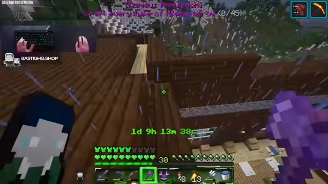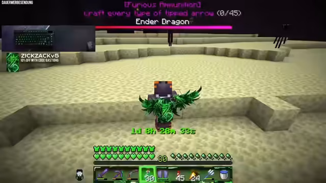 02:04:11Zurück im Spiel, wird der Enderdrache für ein Achievement bekämpft. Strategisch werden vier Endkristalle platziert, um den Drachen gezielt zu provozieren und seine Angriffe abzuwarten. Der Hauptfokus liegt darauf, Dragon's Breath zu sammeln, eine seltene Zutat für starke Tränke. Der Streamer entscheidet, den Drachen nicht sofort zu töten, sondern stattdessen das Potenzial für das Farmen der Ressource voll auszuschöpfen. Das gesammelte Material wird anschließend zur Base transportiert.