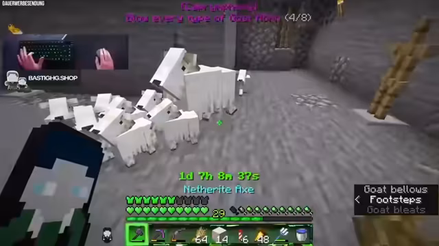00:12:42Der Stream konzentriert sich auf das Projekt '111 Custom Achievements' in Minecraft. Es ist die zweite Folge des Projekts, das auf YouTube hochgeladen wurde. Das aktuelle Ziel ist es, jedes Ziegenhorn einmal zu blasen, wobei es sowohl normale als auch seltene 'Screaming Goats' gibt. Letztere sind für die besonderen Hörner notwendig und müssen mit einer zwei-prozentigen Wahrscheinlichkeit gezüchtet werden.