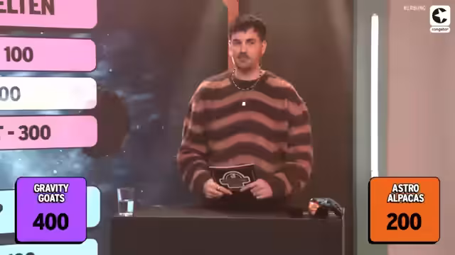 00:23:04Es werden drei verschiedene Spiele gespielt: Zuerst ein Quiz im Stil von Jeopardy und Familienduell mit Kategorien, bei denen Punkte geklaut werden können. Im zweiten Spiel, dem Galaxy Glide, gibt es zehn Fragen mit vier Antwortmöglichkeiten, bei denen auch der Chat aktiv mitwirken muss, um Punkte für das Team zu sammeln. Die letzte Phase ist der Boss Rush, dessen Bedeutung später erklärt wird. Die Kandidaten testen die Buzzer und es wird auf die Möglichkeit hingewiesen, am Ende des Jahres ein Pen & Paper zu spielen. Dafür gibt es einen speziellen zwölfflächigen Würfel zu gewinnen. Zudem wird eine Max gezeigt, die einen Einblick in den heutigen Abend gibt. Es wird ein Streamteam-Duell geben, bei dem Wissen, Zusammenarbeit und Reaktionsfähigkeit getestet werden. Die Teams Astro-Alpakas (Baso und Jenyan) und Gravity Goals (Leon und Kaddi) treten gegeneinander an.
