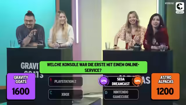 01:21:44Die vierte Frage drehte sich darum, welches der MOBAs Dota 2, Heroes of New Earth, League of Legends oder Smite als letztes auf den Markt kam. Es folgte eine Diskussion über die Spiele, wobei einige zugaben, keine MOBAs zu spielen. Die richtige Antwort war Smite, was der Community weitere 100 Punkte einbrachte. Die fünfte Frage thematisierte, welche Konsole die erste mit einem Online-Service war. Zur Auswahl standen Playstation 2, Sega Dreamcast, Xbox oder Nintendo Gamecube. Die Community wusste die Antwort und rettete die Teams mit weiteren 100 Punkten. Es wurde die Sega Dreamcast gezeigt und ihr Online-Service Dream Arena erwähnt, der aber 2003 eingestellt wurde.