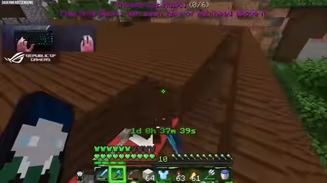 01:31:43Nach erfolgreicher Sammlung der ersten fünf Monsterköpfe steht die Jagd auf den Creeper-Kopf an, der durch ein Gewitter mit Blitzeinschlag mithilfe eines geladenen Creeper erzeugt werden muss. Der Streamer verbringt eine lange Zeit auf das Ereignis wartend, das jedoch nur sehr kurz auftritt. Die dramatische Aktion, bei der der geladene Creeper im letzten Moment aktiviert wird, gelingt und alle sechs benötigten Köpfe werden beschafft, was den Streamer besonders glücklich stimmt.