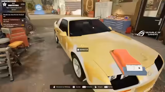 00:28:00Im Spiel kümmert sich der Streamer um die Aufbereitung eines UMX600-Coupés, das er ersteigert hat. Das Fahrzeug ist in einem desolaten Zustand und muss umfassend repariert werden. Ein erster Schritt ist das Scannen des Autos, um den genauen technischen Zustand zu ermitteln. Anschließend beginnt er mit dem mühsamen Prozess des Rostentfernens und der Spachtelarbeit an der Karosserie, um das Fahrzeug wieder verkehrssicher und optisch ansprechend zu machen.