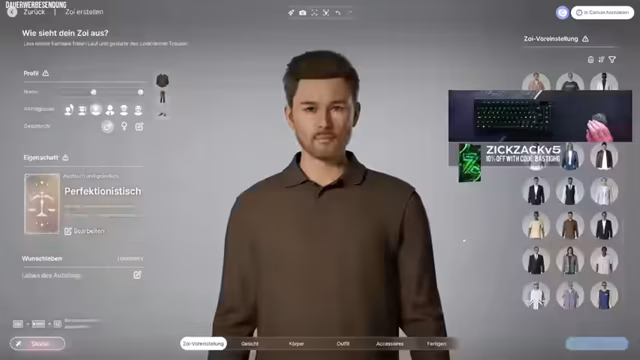 00:53:36Nach dem Gesicht wird der Körper des Charakters angepasst. Der Streamer zeigt kurz sein beliebtestes Video, in dem er als Baby mit zensierter Unterhose zu sehen ist. Die Körperform wird beibehalten, aber Muskeln und Körpergewicht werden angepasst. Es wird überlegt, ob Körperhaare hinzugefügt werden sollen. Anschließend wird das Outfit des Charakters gestaltet. Es wird versucht, ein Outfit zu erstellen, das dem Minecraft-Skin ähnelt, mit einer karierten Hose und einem grünen Schlips. Der Streamer kann die Farben der Kleidung anpassen, aber es gibt Einschränkungen. Es wird überlegt, ob ein Anzug oder ein legereres Outfit gewählt werden soll. Der Streamer entscheidet sich für eine offene grüne Jacke und einen schwarzen Pullover. Es wird versucht, das Outfit so gut wie möglich an den Minecraft-Skin anzupassen. Der Streamer findet, dass das Outfit wie Designer-Kleidung aussieht. Es wird überlegt, ob eine Collegejacke getragen werden soll, aber der Streamer findet, dass diese nicht zum Charakter passt. Es wird nach einer karierten Hose gesucht, aber es gibt keine passende Option. Der Streamer plant, ein eigenes Design hochzuladen, um die karierte Hose zu erstellen.