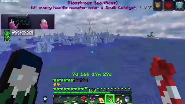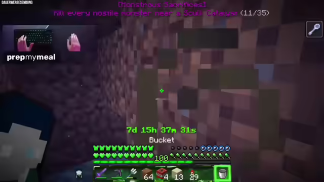 01:22:46Der Streamer startet einen zweiten Versuch, den Elder Guardian zu eliminieren, diesmal mit Trockenlegung. Er sprengt sich einen Durchgang, um genügend Platz zu schaffen, und sperrt sich mit Bob ein. Es wird erklärt, dass Bob nur Schaden macht, wenn sein Strahl direkt auf den Streamer gerichtet ist. Der Streamer versucht, das Wasser aus dem Raum zu entfernen, um einen Skulk-Katalysator zu platzieren. Es wird festgestellt, dass ein Skulk-Katalysator die EP von Bob empfängt, wenn er zwei Blöcke in einem Nachbarraum stirbt. Der Streamer tötet Bob, aber es zählt nicht für das Achievement. Es wird vermutet, dass es in der Overworld sein muss. Der Streamer plant, alle anderen Monster zu eliminieren und am Ende zu sehen, ob Bob eigentlich hätte zählen müssen. Trotzdem wird es noch einmal ganz kurz mit einem Guardian versucht.