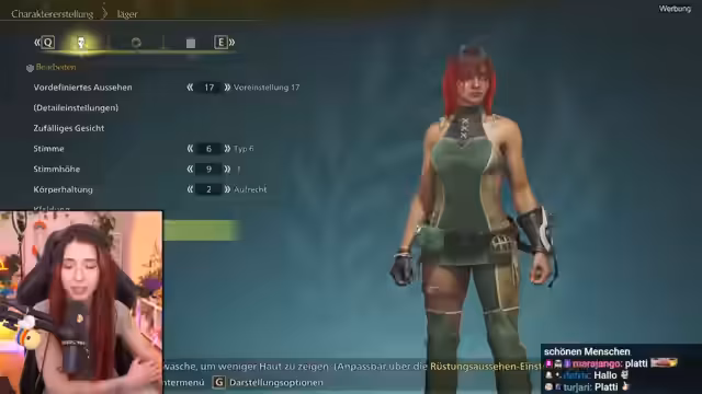 01:44:22Nach der endgültigen Entscheidung für die Frisur und -farbe geht der Streamer die Gesichtsanpassungen durch. Bei der Hautfarbe wird eine leicht gebräunte Variante gegenüber der Standardwahl bevorzugt, um eine realistischere, sonnengegerbte Optik für eine Monsterjägerin zu erzielen. Auch die Hauttextur wird eingestellt, wobei der Streamer einen realistischen Ansatz wählt und Sommersprossen hinzufügt. Bei den Augen wird hellgrün als gewünschte Farbe identifiziert. Die Option, zwei verschiedene Augenfarben zu wählen, wird genutzt, um ein Auge hellgrün und das andere lila zu gestalten, was dem Charakter eine einzigartige Cyborg-Optik und mystische Story verleiht. Die weiteren Augen- und Nasenparameter werden größtenteils auf Standard belassen, um ein natürliches Aussehen zu bewahren.
