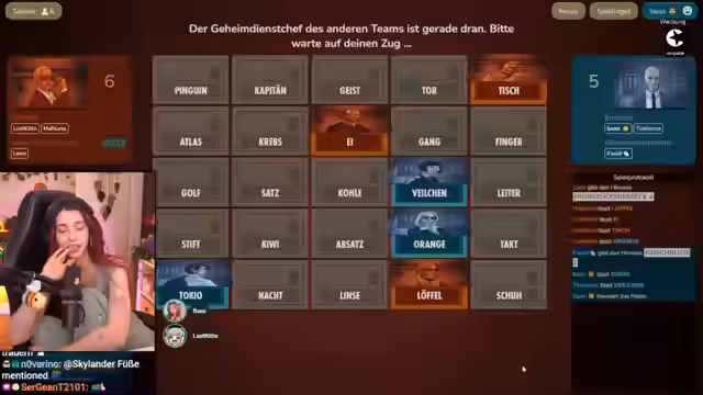 06:02:40Nachdem die erste Runde beendet ist, wechseln die Teams die Seiten. Ein neuer Geheimdienstchef übernimmt die Führung. Die neue Runde startet mit einer neuen Wortliste, die Begriffe wie 'Feichen', 'Gang' und 'Krebs' enthält. Das Gameplay bleibt dynamisch, wobei die Spieler versuchen, durch kreative Wortverbindungen und manchmal auch mutige Wild Guesses die Lösungen zu finden und den gegnerischen Geheimdienstchef zu täuschen.