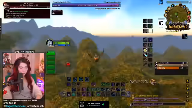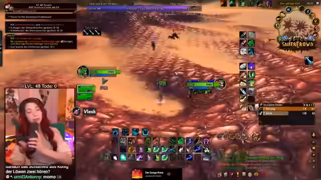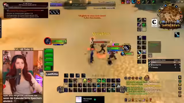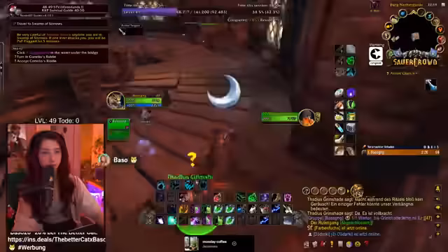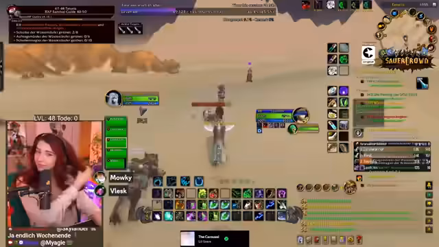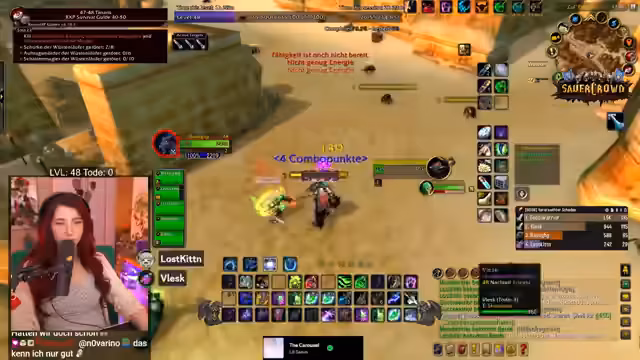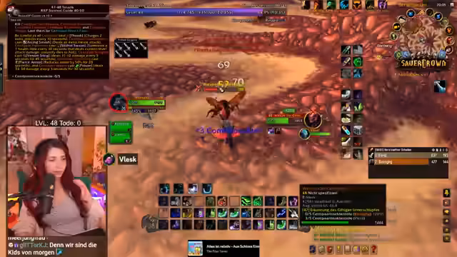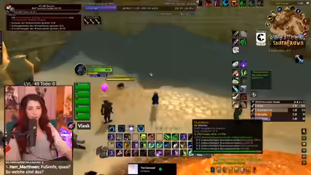 06:58:53Die Streamerin arbeitet mit anderen Spielern zusammen, um eine gefährliche Quest zu bewältigen, die normalerweise im Team gespielt werden sollte. Es kommt zu PvP-Interaktionen, während die Stimmung im Chat aufgeregt ist und der Streamer Close Calls erlebt. Sie beschreibt die Erfahrungen im Hardcore-Modus, bei dem ein Tod den Charakter bedeutet. Sie ist müde, aber motiviert weiterzuspielen und erklärt dem Chat WoW-Mechaniken und den Spielspaß, trotz des Zeitdrucks.