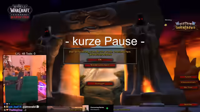 01:01:47Nachdem ein Prinzessin-Dungeon erfolgreich absolviert und Loot erhalten wurde, muss der Streamer eine längere Pause einlegen. Er hat seit einer halben Stunde einen dringenden Toilettenbedarf, was eine Unterbrechung erfordert. Während der Abwesenheit fliegt er mit dem Boot nach Booty Bay und nach Bessetlands, was als "taktische Zwischenlandung" humorvoll erwähnt wird. Die Chat-Interaktion bleibt auch während der Abwesenheit rege.