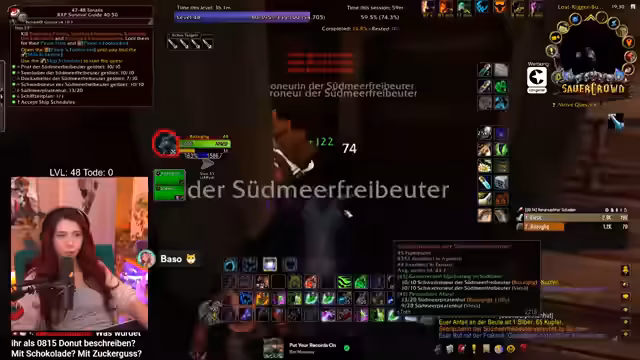 06:50:14Die Streamerin findet eine Flaschenpost mit einem Tagebucheintrag, der philosophisch über Allianz und Horde nachdenkt und schließlich bei Bananen landet. Es folgt eine absurde Geschichte vom Bananenkrieg. Anschließend beginnt sie eine Quest gegen Piraten in Booty Bay. Dabei kommt es zu gefährlichen Momenten, darunter ein angeblicher Hai, und es werden mehrere Schiffe durchsucht, um Rätsel zu lösen und Kapitäne zu besiegen, um die Piratengesellschaft zu schwächen.