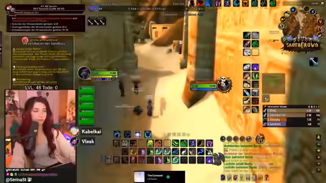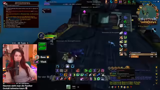 08:10:23Nachdem die Probleme mit den Sounds geklärt sind, fliegt der Streamer nach Westfall, um eine neue Quest anzunehmen. Diese Quest erfordert den Transport von heiligem Quellwasser und später die Beschaffung seltener Zutaten wie einer Windstahlblume. Der Streamer bemerkt dabei, dass Inventarplatz ein häufiges Problem ist und er oft gezwungen ist, wichtige Items zu verlassen. Die Jagd nach den benötigten Kräutern beginnt, wobei er die Chat-Community bittet, ihm Spawnpoints für die Windstahlblume in ganz Azeroth zu nennen.