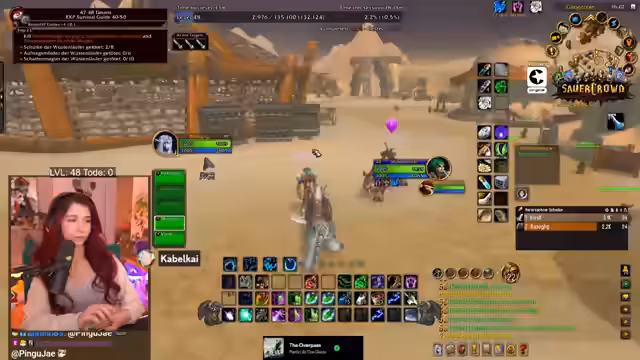 08:39:05Die Suche nach der raren Windstahlblume führt den Streamer in ein gefährliches Gebiet, das von der Horde kontrolliert wird. Dabei geraten sie in ein PvP-Lager, wobei die Gegner jedoch so schwach sind, dass sie keine ernsthafte Bedrohung darstellen. Trotzdem reitet der Streamer vorsichtig um das Lager herum, um nicht unnötig in einen Kampf verwickelt zu werden. Das Ziel bleibt das Finden der benötigten Kräuter, um die Alchemie-Quest erfolgreich abzuschließen.