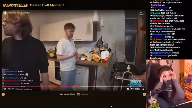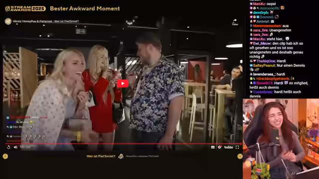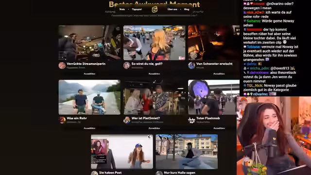 00:54:17Die Betrachtung der Kategorie 'Bester IRL-Moment' beginnt mit einem bemerkenswerten Clip, in dem ein Streamer auf einer öffentlichen Veranstaltung auf einen 'Datenschutzpapier'-Vorfelddruck stößt. Der Streamer zeigt sich von der Realität und der eskalierenden Situation tief beeindruckt. Dennoch wird dieser Clip von der im Anschluss gezeigten Aufzeichnung 'Heiko' in den Schatten gestellt, bei der ein zufälliges, unfreiwilliges Erbrechen eines Hundes zu unkontrolliertem Lachen im Chat und beim Streamer führt. Diese völlig unscriptete und zufällige Situation gilt als absoluter Höhepunkt des Abends.