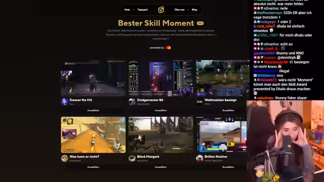 01:53:59Der Streamer stellt die neue Kategorie 'Bester Skillmoment' vor und bewundert die nominierten Clips, die Präzision und können zeigen. Er ist beeindruckt von Divis No-Hit-Erfolg in Dark Souls, der trotz des Risikos mit dem Rollen-Dodge gelingt, und von Dalus Geschicklichkeit in Mario Kart, der für perfekte Abkürzungen bekannt ist. Er findet die Entscheidungen schwierig, da er mit manchen Spielen wie Dark Souls nicht vertraut ist, hebt aber die unglaubliche Leistung aller Nominierten hervor.