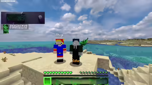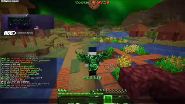 02:46:48Stegi versucht verzweifelt, einen Tropical zu angeln, während Basti nach einem warmen Ozean sucht. Die Zeit läuft ab und Stegi schafft es nicht, den Tropical zu bekommen. Basti erhält Scaffolding orange terracotta und Stegi muss Clay abbauen und braten. Sie haben wenig Essen und suchen nach Betten in einem Dorf. Basti wird von einem brennenden Zombie angegriffen und hat nur noch wenig Leben. Stegi gibt ihm Clay und sie machen Öfen. Sie werden sich wieder reequippen und ins Spiel zurückkommen. Stegi kümmert sich um die Öfen und Basti farmt Stein. Stegi macht Orange Terracotta und Basti geht Stein farmen. Sie haben wenig Herzen und bereiten sich auf den Wither-Kampf vor. Basti farmt Clay und Stegi checkt die Nachfrage. Basti hat sein Item und geht zurück zum Dorf. Sie sind stolz aufeinander und Basti braucht Essen.
