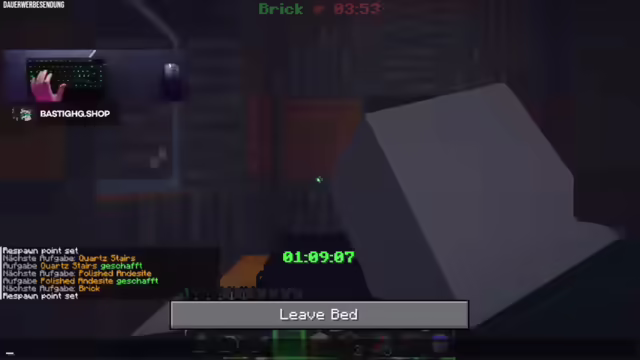 02:16:07Nach einem Inf-Clear müssen sich Basti und Stegi neu ausrüsten und erhalten neue Items. Stegi bekommt Clayball und Light Grey Banner, während Basti sich um Essen und Eisen kümmert. Sie bauen eine Wendeltreppe, um sich vor Mobs zu schützen, und scheren Schafe für Wolle. Basti plant, wieder in den Nether zu gehen, während Stegi sich um die Beschaffung von Wolle kümmert. Sie diskutieren die Möglichkeit, Betten zu nutzen, um die Nacht zu überspringen, und Basti plant, erneut in den Nether zu gehen. Stegi hat Schwierigkeiten mit Skeletten und benötigt Essen. Basti versorgt ihn mit Melonen und Clay Ball. Stegi equip sich wieder und baut einen Banner. Basti brät Eisen und bietet Stegi ein Bett und ein Namensschild an. Sie hoffen auf chilligere Items, da ihre Basis fehlt. Basti versorgt Stegi mit Brot und sie bereiten sich auf das nächste Item vor.