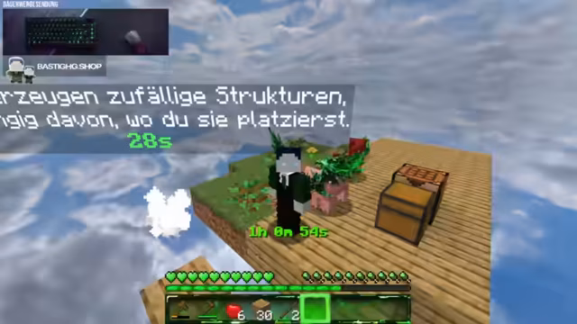00:27:10Das Spielprinzip besteht darin, mysteriöse Eier zu platzieren, um zufällige 5x5-Strukturen zu generieren, die von Grasflächen bis hin zu Nether- oder End-Bereichen reichen können. Zu Beginn muss der Streamer mit sehr begrenzten Ressourcen wie einem Schaf, etwas Holz und Äpfeln überleben und hofft, weitere Setzlinge für Baumplantagen zu erhalten, um seine Insel zu erweitern.