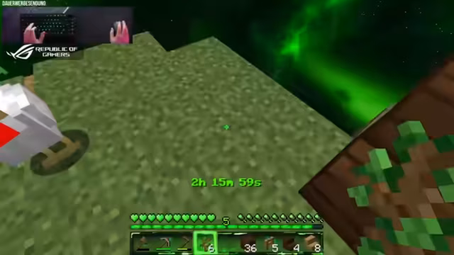 03:00:40Nachdem ein weiteres Ei gespawnt ist, wird die Fläche der Insel mit gewonnenem Dirt und Materialien von einer Kuh wieder aufgebaut. Dies macht die Insel größer und angenehmer zu bewohnen. Die erhaltenen Dark Oak Saplings ermöglichen nun den Anbau großer Bäume, um Holz in größerem Stil zu produzieren. Um den Fortschritt fortzusetzen, muss nun mehr Eisen aus den Höhlenstrukturen beschafft werden, um eventuell eine Mob-Farm zu bauen. Eine Kuh erhält spontan den Namen Thomas und wird Teil der wachsenden Inselbevölkerung.