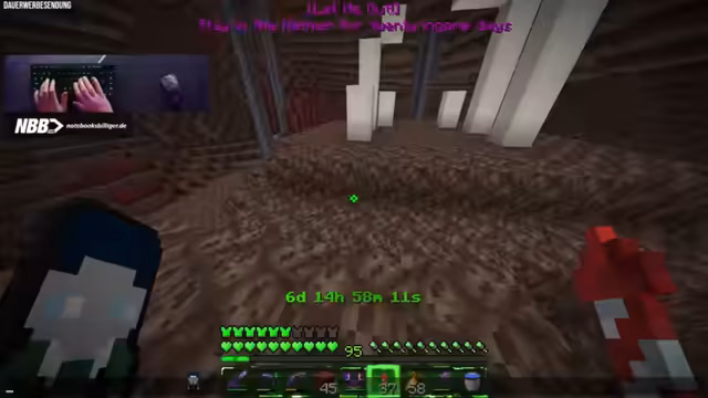 01:44:34Der Fokus des Streams liegt auf dem Grinden von Gold in der Nether-Goldfarm. Der Streamer muss noch etwa 20 Ingame-Tage, was 6 Stunden und 40 Minuten entspricht, im Nether bleiben, um ein Achievement zu erreichen. Das Projekt wird als sehr grindlastig beschrieben, wobei es der Meinung ist, dieses Ziel auf eine entspannte Weise zu erreichen. Geplante Streams am Wochenende wie ZVPD werden angekündigt.