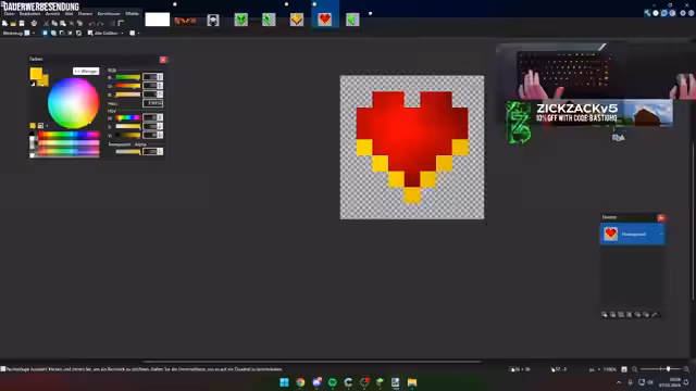 00:37:51BastiGHG beginnt mit der Anpassung der Herzen in der GUI des Texture Packs, wobei er zunächst den richtigen Farbton finden muss. Er experimentiert mit verschiedenen Farben, um die Farben der Golden Ruby Cosmetics widerzuspiegeln. Er betont, dass die Farben harmonieren müssen und dass die schwarze Kontur um die Herzen nicht außer Acht gelassen werden darf. Er verändert den Aufbau der Herzen und experimentiert mit verschiedenen Formen und Farben, wobei er jedoch darauf achtet, dass die Herzen nicht zu sehr ins Orange gehen. Er testet verschiedene Varianten, darunter invertierte Farben und diagonale Teilungen, ist aber mit den Ergebnissen nicht zufrieden. Er überlegt, die Form der Herzen anzupassen, verwirft diese Idee aber wieder. Er experimentiert weiter mit verschiedenen Farbkombinationen und Mustern, ist aber noch nicht zufrieden mit dem Ergebnis.