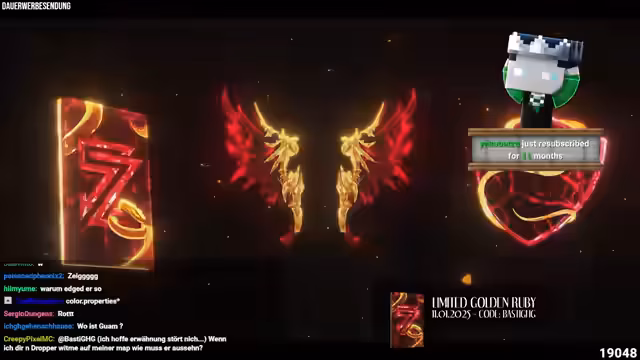 00:09:10Der Stream beginnt mit der offiziellen Ankündigung der neuen Special-Cosmetics für die 2 Millionen Abonnenten, die ab dem 11.01. erscheinen werden. Es handelt sich um die Golden Ruby Edition, die zum ersten Mal zwei Farbtöne, Rubinrot und Gold, in einem Design vereint. Der Streamer zeigt sich begeistert vom Design und betont, dass es auf der Basis der vorherigen Editionen aufgebaut ist und für 30 Tage im Shop erhältlich sein wird.