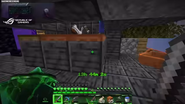 01:39:49Nachdem die Zombie-Farm als funktionierend erachtet wird, nutzen die Streamer die durch die Drops erhaltenen Level, um Ausrüstung wie Bögen und Ambos zu verzaubern und aufzuwerten. Sie planen eine Reise in den Nether, um dort nach einer Festung zu suchen, die für das Fortschreiten der Challenge notwendig ist. Die Farm bleibt dabei in der Overworld aktiv, um kontinuierlich Level zu farmen.