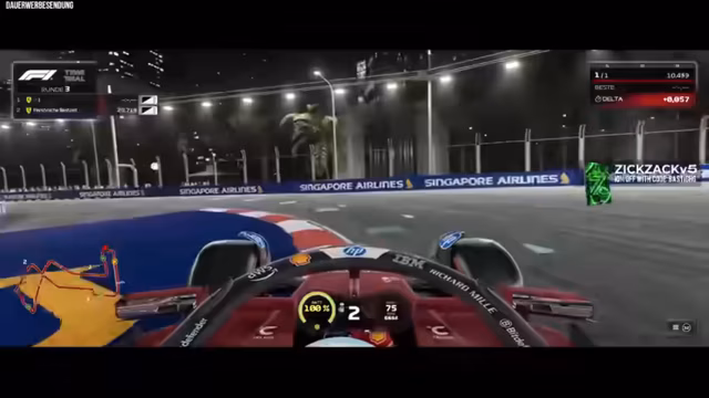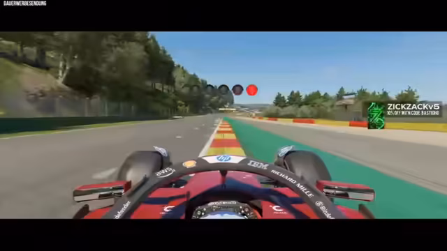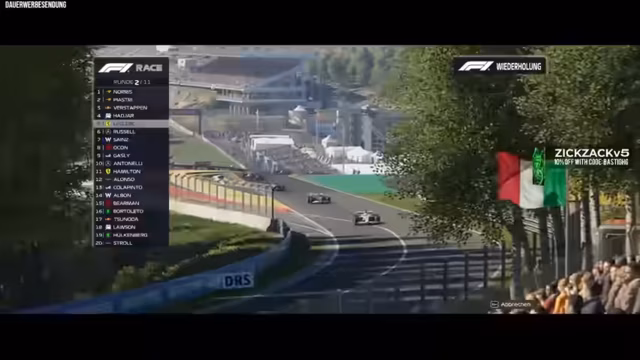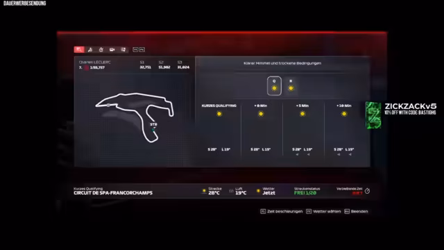 04:01:57Basti entscheidet sich für ein Rennen auf Spa, da dies seine bisher beste Strecke war. Er senkt die KI-Stärke auf 40 und qualifiziert sich mit seinem Ferrari. Das Qualifying endet mit dem fünften Platz. Währenddessen erklärt er kurz seine Strategie: Fokus auf Verteidigung und Nutzung der DRS-Geraden. Teamfunk mit Jeff läuft, Probleme mit dem Frontflügel werden bemerkt. Die Startaufstellung wird bekanntgegeben, mit Lando Norris auf Pole-Position.