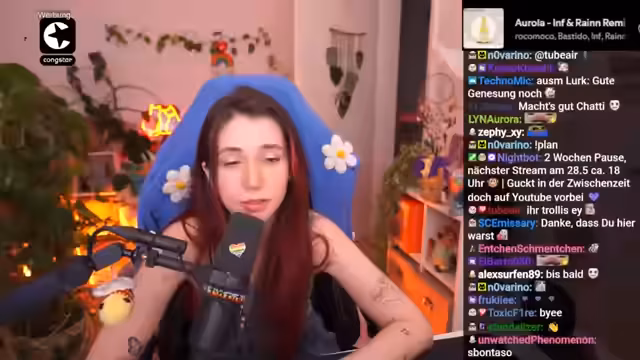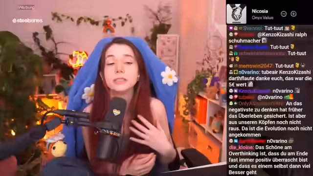 00:12:26Zu Beginn des Streams zeigt sich die Streamerin sehr nervös und aufgeregt, da sie nach langer Zeit wieder an diesem Setup streamt. Sie bittet das Publikum um Verständnis, da es ihr schwerfällt, über ein sehr persönliches und intimes Thema zu sprechen. Sie gibt offen an, dass dies für sie ein schwerer Moment ist und sie Angst vor negativen Reaktionen hat, was ihre Unsicherheit für alle Beteiligten deutlich werden lässt.