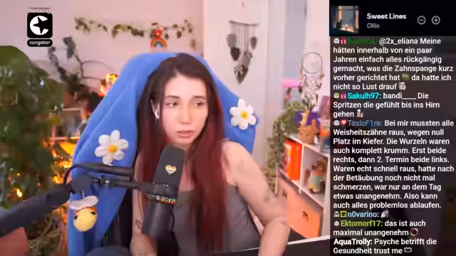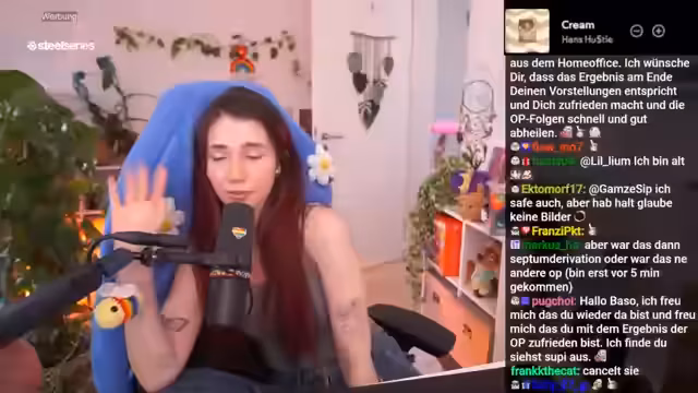 01:07:14Die Streamerin beantwortet Fragen der Community und gibt Einblicke in den Prozess und die Nachsorge. Sie beschreibt die Operation als sehr unangenehm, mit einer langen und belastenden Genesungszeit, in der sie durch den Mund atmen musste und sich für Wochen kraftlos fühlte. Zudem nennt sie die Kosten von 6000 Euro nach Erstattung von 1000 Euro durch die Krankenkasse, die sie auch aus Transparenz teilt.