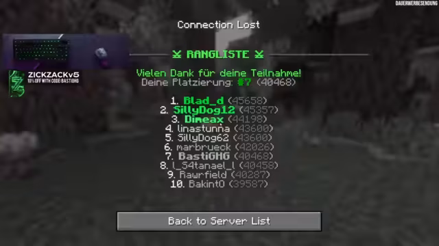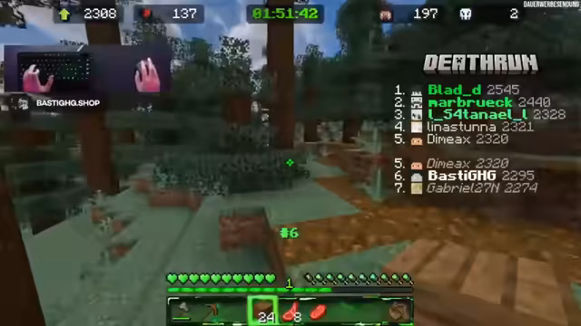 02:15:15Die Teilnahme an Deathrun-Events wird spontan im Stream angekündigt, ohne große Vorankündigungen, da bei Events mit beispielsweise 200 Spielern nur eine begrenzte Anzahl teilnehmen kann. Eine frühzeitige Ankündigung würde nur unnötige Erwartungen schüren. Im Ultra-Hardcore-Modus gibt es keine Regeneration durch Suppen, Goldäpfel oder Tränke; einmal verlorene Herzen sind dauerhaft weg. Dies macht das Spiel extrem anspruchsvoll, da selbst kleine Fehler wie Fallschaden weitreichende Konsequenzen haben. Der Spieler befindet sich derzeit auf Platz 9, mit der Ambition, die Top 5 zu erreichen. Es wird überlegt, ob in der verbleibenden Stunde noch ein 'Game-Changer' gefunden werden kann, wie etwa ein Slime für eine Leine. Die Diskussionen im Chat zeigen auch, dass viele Spieler die Herausforderungen des Ultra-Hardcore-Modus noch nicht vollständig verinnerlicht haben, was zu wiederholten Fragen über Regenerationsmöglichkeiten führt.