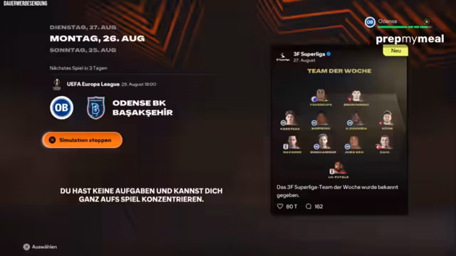 05:50:56Der Stream wechselt zur Simulation des ersten Spiels der Europa-League-Qualifikation. Trotz der personellen Probleme – der Kader hat nur drei Innenverteidiger – beginnt die Partie positiv. Nachdem das Team in Rückstand gerät und durch eine künstlich herbeigeführte Szene einen fragwürdigen Elfmeter erhält, wird das Spiel durch eine Simulationsspannung gedreht. Die Offensive, insbesondere Fiete, trifft doppelt und sichert den Einzug in die Europa-League-Gruppenphase. Dieser Sieg feiert man als großen Erfolg für den kleinen Club.