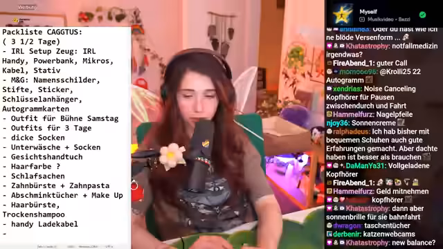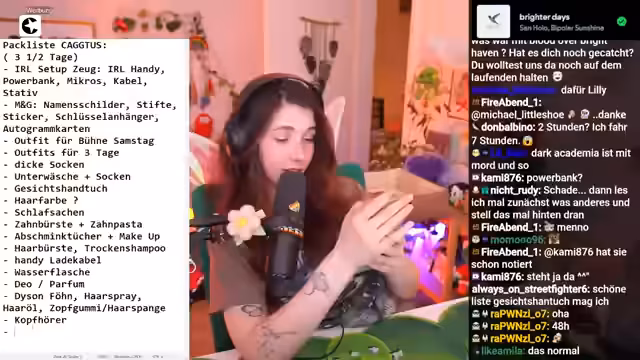 01:19:49Ausführlich listet der Streamer alle Gegenstände auf, die er für das Festival benötigt, darunter Outfits für mehrere Tage, dicke Socken, Unterwäsche, Kosmetikartikel, Haartrockner und Desinfektionsgel. Er betont die Wichtigkeit bequemer Schuhe, basierend auf positiven Erfahrungen während einer Japanreise, und diskutiert die Vor- und Nachteile verschiedener items wie Sonnencreme und Bücher. Sein Kater Ferox hat sich spontan in den Koffer gelegt und soll mitreisen.
