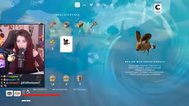 04:04:44Es wird eine Inselerkundung vorbereitet und das Inventar wird aufgeräumt. Es werden Pilze gesucht und eine riesige Insel entdeckt. Es wird beschlossen, die Pilze anzugreifen. Es wird ein Schnelligkeits-Buff durch ein Getränk oder Essen festgestellt. Es werden kranke Bäume auf der Insel gefunden und pinke Schmetterlinge entdeckt. Es wird erwähnt, dass die Bäume im Buch markiert sind. Karottenbrot gibt einen Schnelligkeits-Buff. Es müssen Kleintiere und Insekten freigelassen werden. Es wird ein Wurm und eine Biene freigelassen. Hartholz wird entdeckt. Es wird ein weiteres kleines Tierchen und ein Baum benötigt. Es wird ein Baum gefällt, um einen Baum zu pflanzen. Es wird eine Wüstenmaus auf der Insel entdeckt. Es werden Akaziensamen benötigt. Es wird Mio-Mate getrunken. Es wird über den Koffeinkonsum diskutiert und Energydrinks werden kritisiert. Es wird ein Vogel für die Insel benötigt. Es wird überlegt, welcher Vogel auf die Insel darf und Willow wird ausgewählt. Es wird versucht, näher an die Insel heranzufahren, aber es gibt Probleme. Es muss ein kaputtes Vogelhaus repariert werden. Es wird Blattstoff benötigt. Ein Vogel wird in der Wüste ausgesetzt.