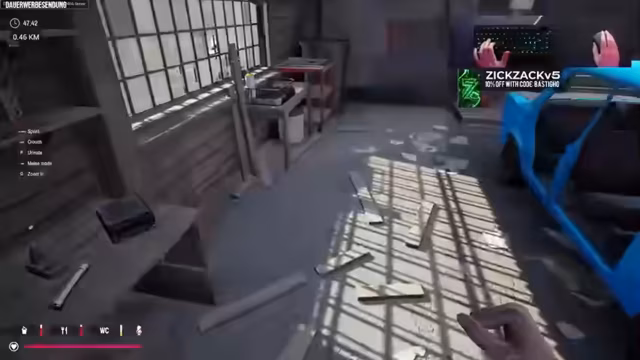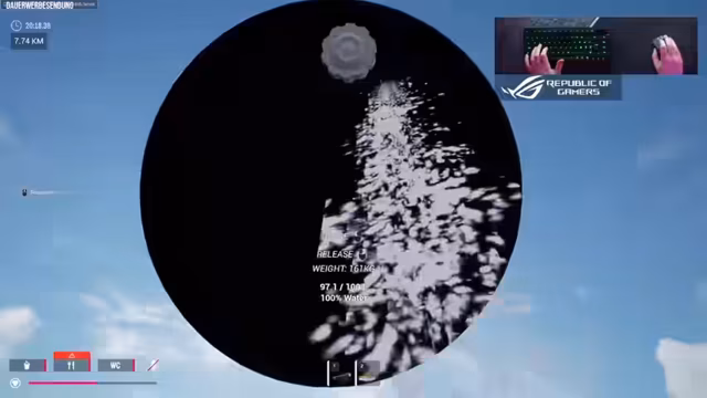 03:29:35Auf dem Weg zu ihrem Ziel von 100 Kilometern halten die Spieler an einem ersten Spot, um Ressourcen zu sammeln. Sie finden und nehmen große Mengen Wasser, einen Reifen und weitere Gegenstände wie eine Stoßstange mit. Der Spielfluss wird jedoch durch einen zufälligen Raketenwerfer unterbrochen. Eine unsachgemäße Handhabung der Waffe führt dazu, dass wichtige Teile des Autos, einschließlich der Karosserie und aller Reifen, weggeschossen und weit verstreut werden. Dies zwingt die Spieler erneut zu einem Rücksetzpunkt.