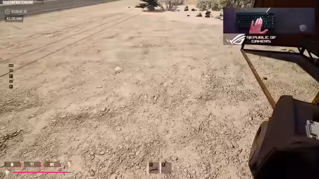 04:59:17Die Distanz von 40 Kilometern wird überschritten. Der Streamer analysiert die aktuelle Situation: Wasser wird zur knappen Ressource. Das Ziel ist es, einen großen Wasserkanister zu finden. Die Spieler nutzen jeden Loot-Spot maximal aus, um Vorräte für Essens-, Trink- und Benzinbedarf zu sammeln. Das Fahrzeug wird dabei zunehmend beschädigt und muss improvisiert repariert und weiter betrieben werden, um die Enddistanz zu erreichen.