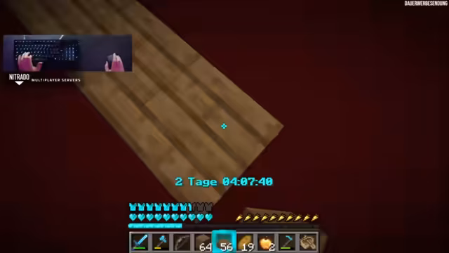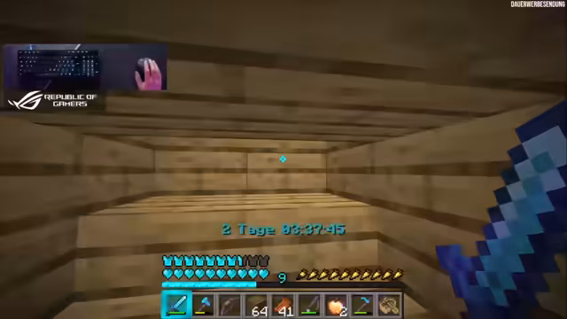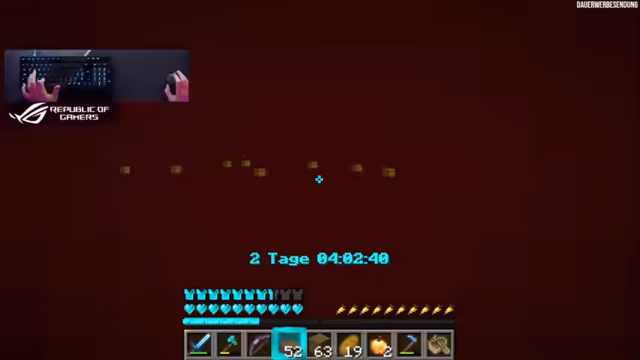 00:38:39Nachdem die benötigten zehn Obsidian-Blöcke zusammengetragen wurden, plant der Streamer den lang ersehnten Schritt in den Nether. Die gesamte Reise dorthin hat über 50 Stunden gedauert. Er stellt sein Equipment für den bevorstehenden Kampf vor: ein Diamantschwert mit den Verzauberungen Looting 2 und Schärfe 4 sowie einen Bogen mit „Unendlich“, Stärke 4 und Flammen. Er ist sich sicher, dass diese Ausrüstung für die bevorstehenden Herausforderungen ausreicht.
