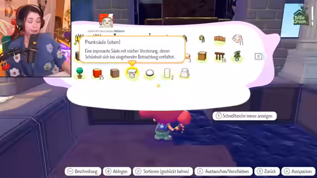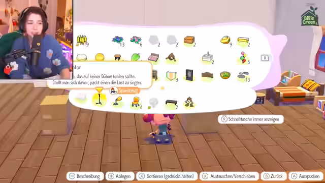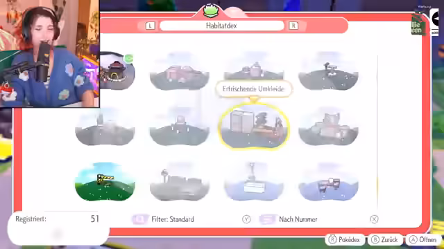 02:23:09Der Streamer erhält vom Gierspenst den Auftrag, ein Habitat für dieses Pokémon zu bauen, das Luxusmöbel wie ein Bett, einen Tisch, eine Lampe und ein Sofa erfordert. Im Inventar bereits vorhandene Gegenstände wie die Lampe werden getauscht, während der Streamer nach weiteren Möbelstücken suchen muss. Gleichzeitig überlegt der Streamer, ob er auch Habitats für andere seltene Pokémon wie ein 'edles Haustier-Pokémon' bauen könnte, das eventuell ein Bett benötigt.