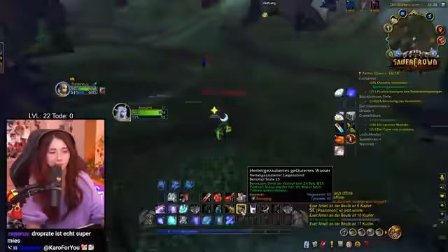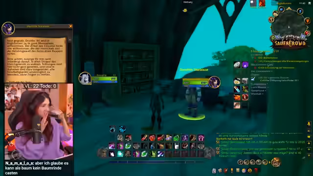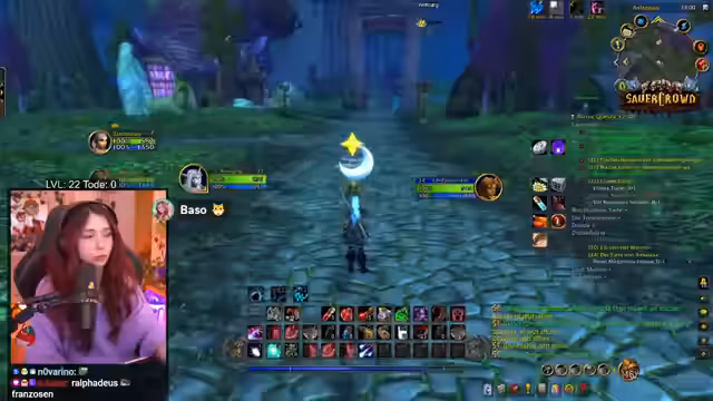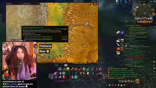 01:36:25Baso sucht in Moonglade nach Quest-Gebern, um eine Droide-Quest für die Schwimmform (Wasseratmung) zu starten. Sie ist unsicher, wo genau sich die Quest-geber befinden, und erkundet die Gegend, dabei muss sie mehrfach Gegner im Wasser bespielen. Sie hat eine Timer-Quest abgebrochen, weil sie den Mechanismus nicht kannte, und sucht nun nach der Möglichkeit, sie wieder aufzunehmen. Die Quest ist komplex, da sie Gegenstände in Wasserregionen finden und zum Schrein von Remulos im Nordwesten bringen muss. Sie tauscht sich mit anderen Spielern im Chat aus, die ihr helfen, die richtigen Orte zu finden.
