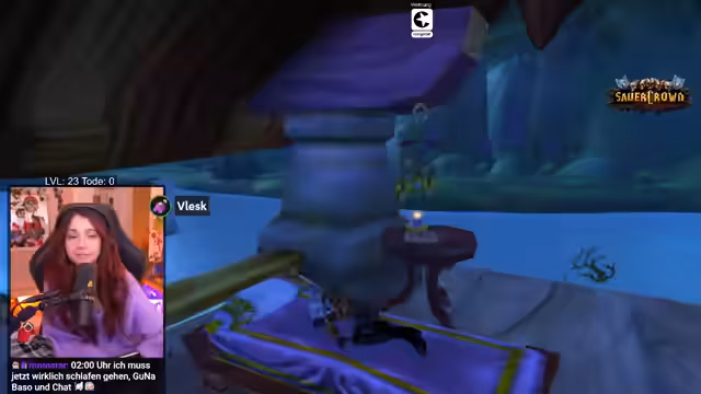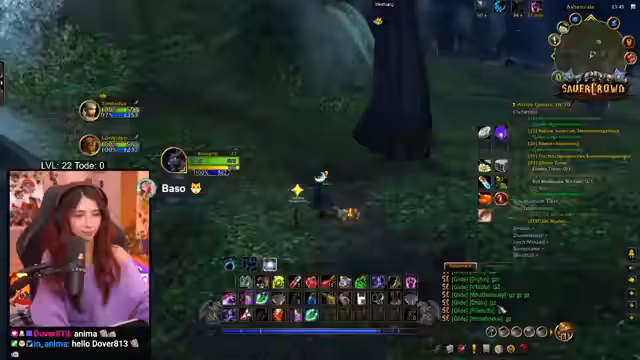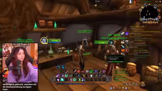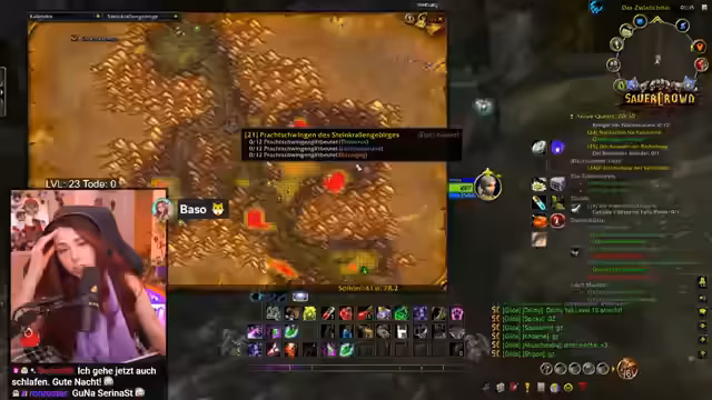 01:49:23Baso teilt ihre Erfahrungen mit Dungeons wie den Deadmines, die sie mit Gruppen absolviert hat. Anfangs hatte sie Schwierigkeiten, eine Gruppe zu finden, aber durch Kooperation mit anderen Spielern wie Tim und John's konnte sie mehrere Durchläufe meistern. Als Droide übernimmt sie auch die Heilerrolle in Gruppen, kämpft aber mit Manaproblemen, weshalb ihre selbstgebrauten Tränke essenziell sind. Sie steht unter dem Druck, für den gemeinsamen Raid auf Level 60 zu kommen, und ist motiviert, weiter zu questen, auch wenn sie als Noob noch viel lernen muss. Sie interagiert aktiv mit dem Chat, um Tipps zu erhalten.