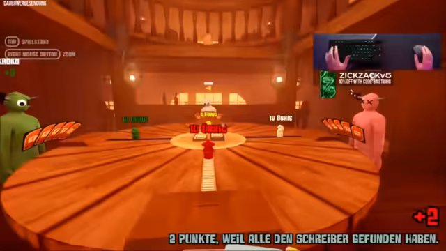02:53:59Ein Teilnehmer gelingt es mit einer sehr cleveren Karte, die auf einen Insider-Witz basiert, nur zwei Mitspieler zu verwirren und somit die maximal möglichen Punkte zu erhalten. Ein anderer Teilnehmer versucht, durch das Nutzen von Chatwissen und offensichtlichen Begriffen Punkte zu sammeln, was aber von der Gruppe als respektlos und unfair kritisiert wird. Die Stimmung bleibt trotz der komplexen Taktiken humorvoll und ein Teilnehmer fühlt sich nach einer Runde, bei der er als Zielsynonym herhalten musste, gebodyshamet.