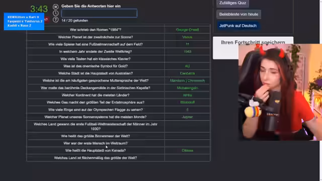 01:47:02Es wird zum nächsten Spiel übergegangen, einem Quiz. Es werden die Regeln erklärt: Die Teams ziehen sich in Discord-Channel zurück, um gemeinsam die Fragen zu beantworten. Es gibt ein Zeitlimit, und am Ende werden die Ergebnisse verglichen. Es wird geklärt, ob sich das Team auf eine Antwort einigen muss oder ob jeder einzeln antwortet. Es wird betont, dass man sich gegenseitig unterstützen kann. Es wird vorgeschlagen, die Chats zu schließen, um Schummeln zu verhindern. Es wird erklärt, wie man das Quiz im Vollbildmodus öffnet und die Kamera an der Seite platziert. Es wird gefragt, welche Art von Quiz es ist. Es wird erwähnt, dass man Voice 2 für sich und Kati reserviert hat. Es wird sich auf das Quiz gefreut. Es wird sich gewünscht, dass man gut abschneidet. Es wird erwähnt, dass man im Stream anzeigen muss, dass man startet. Es wird vorweggenommen, dass Streamer dumm sind und nichts wissen. Es wird gesagt, dass man alles gewusst hätte. Es wird gesagt, dass man das wissen muss, weil es Allgemeinwissen ist.