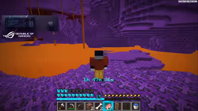 02:36:12Angesichts der aussichtslosen Lage und der knappen Zeit versucht der Streamer, den Schaden zu minimieren und das Beste aus der Situation zu machen. Er nutzt Lava, um Hoglins zu töten und sich Nahrung zu beschaffen. Das Risiko ist jedoch hoch, da er sich selbst gefährdet. Die Suche nach einer Festung bleibt weiterhin Priorität, ist aber durch die unvorhersehbaren Blockwechsel extrem erschwert. Er überlegt, einen Fire Charge zu verwenden, um ein weiteres Portal zu aktivieren, wird aber durch das Fehlen von Feuerzeug und den zufälligen Austausch von Blöcken daran gehindert. Er bleibt gefangen in einem Zyklus aus Kampf, Ressourcenmangel und der ständigen Angst, von dem 10-Minuten-Timer überrascht zu werden.