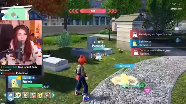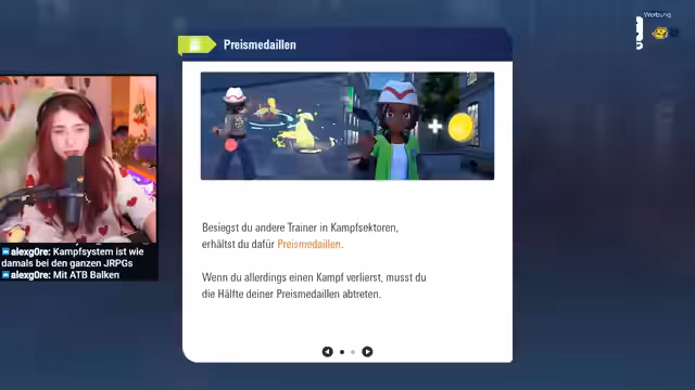 01:30:13Im Kampfsektor stellt der Streamer sich einem Kampf, nachdem seine Reisetasche von einem Pampam gestohlen wurde. Er wählt als Partner-Pokémon das süße Endivir. Im ersten Kampf gegen Backpackerin Arnuk und deren Pampam zeigt sich die neue, offene Kampfmechanik gewöhnungsbedürftig, wird aber als spannend empfunden. Nach dem Sieg erhält er die Tasche zurück und entscheidet, Endivir als ständigen Begleiter zu behalten.